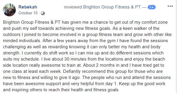 "Brighton Group Fitness & PT is a great group of people who challenge where you are at to help get you to the fitness level you want to be at, while having fun. The sessions feel light hearted and friendly. Best of all you don't feel you need to be super fit to join in. I recommend Brighton Group Fitness for anyone who wants to feel just a bit healthier or motivated to a high level. So far I have seen a reduction in my weight since coming, and coming regularly helps me control my depression naturally.."